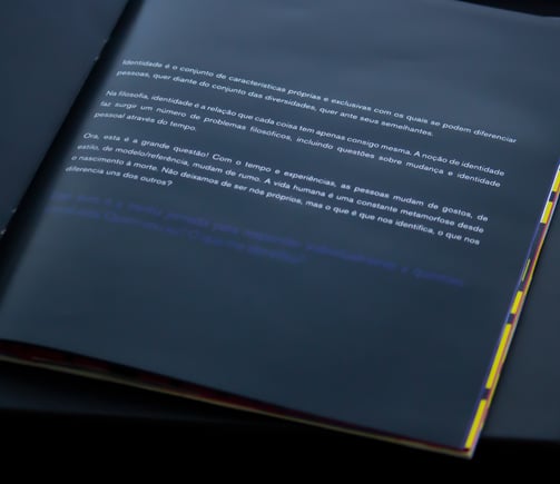 The book unveils memories and insecurities, contrasting its dark themes with bold, vibrant colors. Within the textual compositions, it includes mirrored films that reflect the reader's being and surroundings. The core concept revolves around reflection. How I see myself, how I perceive the world around me, and how others might see me.